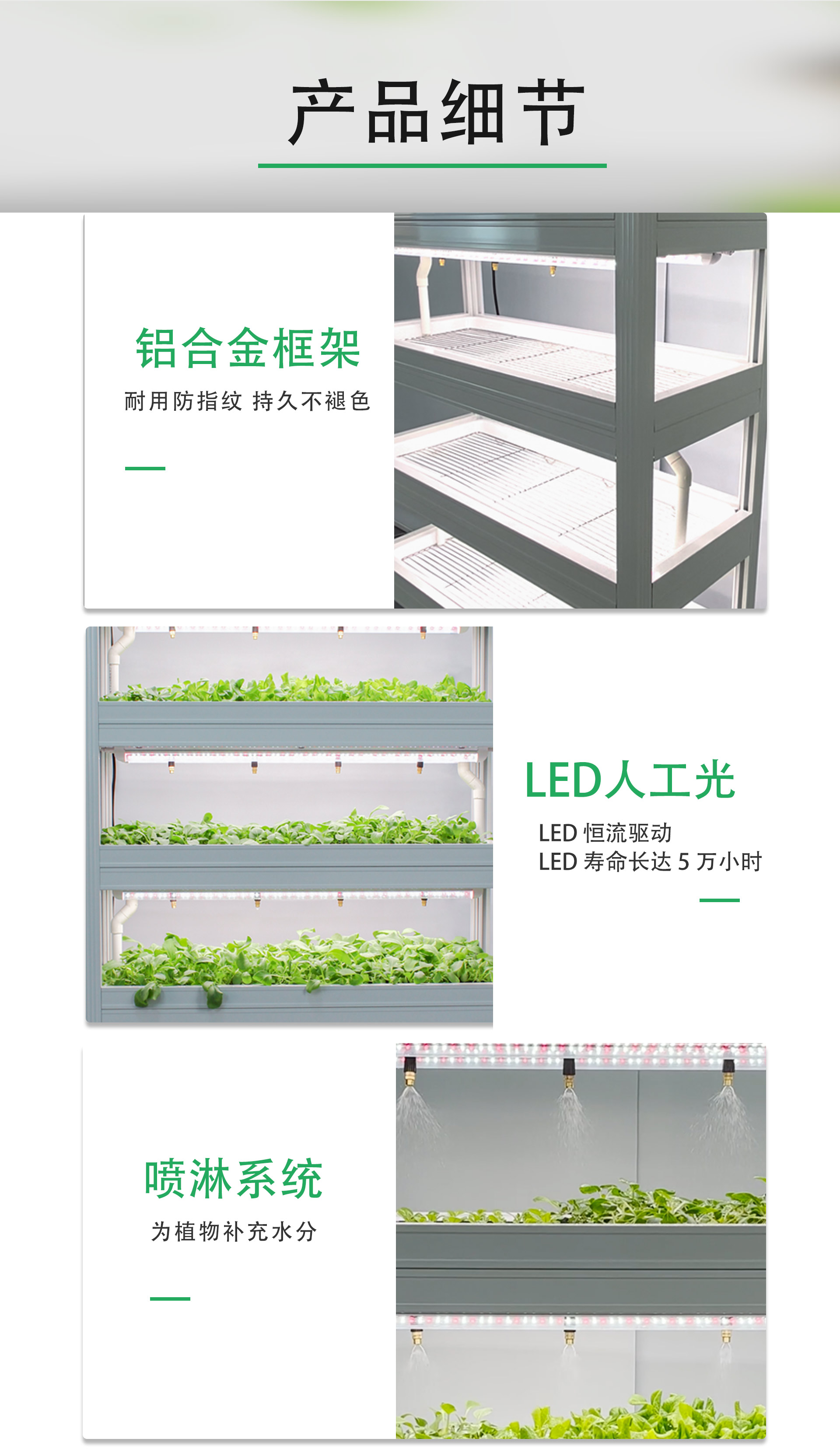 8. 整機框架為鋁合金材質,種植上蓋和水箱為環保pp材料,種植槽為PET環保材料;
