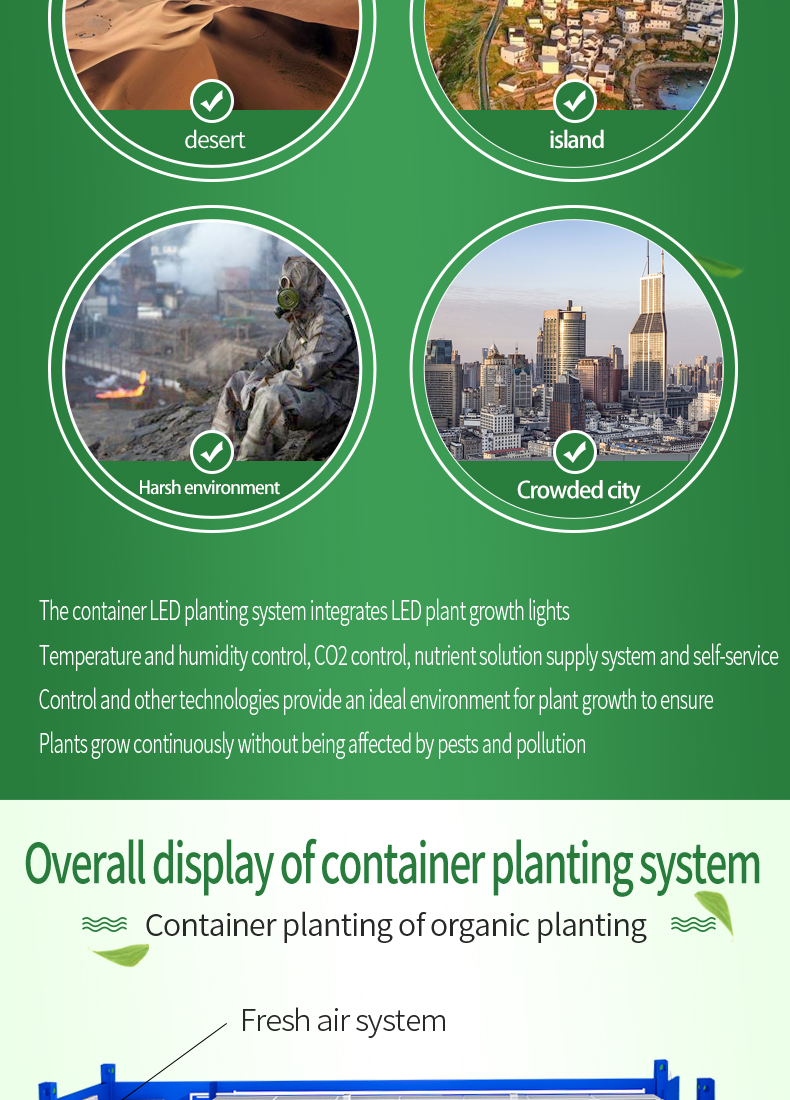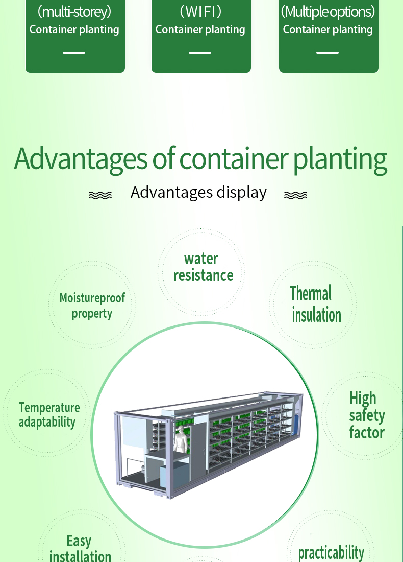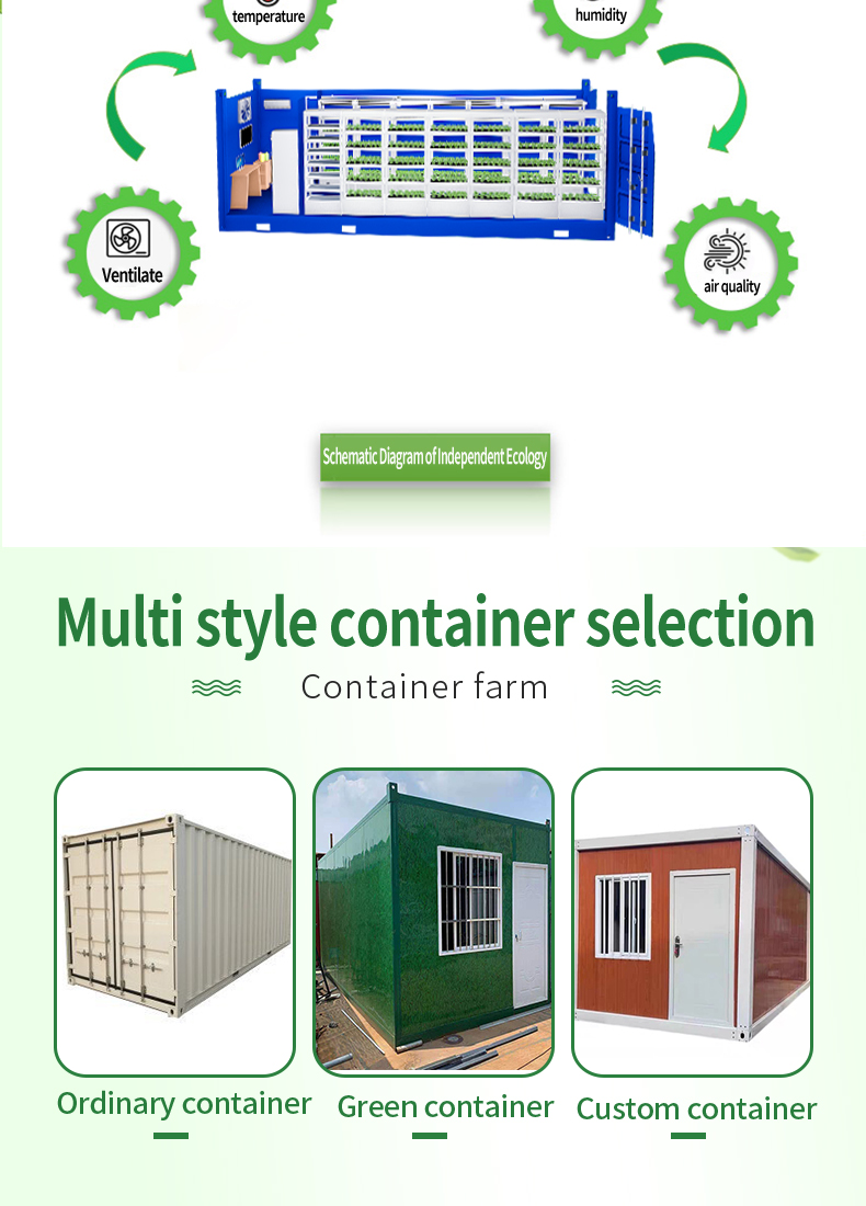This hydroponic plant system is an efficient method of growing plants without soil. The system provides nutrients to plants suspended in a closed enThe container plant factory is an innovative agricultural production model that places the plant planting and growth process in containers. This kind of factory usually uses advanced control systems, including automatic irrigation, light control, temperature and humidity regulation, etc., to simulate the environmental conditions most suitable for plant growth. Advantages of this plant factory include: Location flexibility: Containerized plant factories can be established anywhere in the city without the need for large tracts of land, thereby being closer to markets and reducing transportation costs and energy consumption. Seasonal independence: Due to the control of the indoor environment, this kind of factory can produce crops at any time throughout the year without seasonal restrictions. High water resource utilization efficiency: By recycling water resources and precise irrigation control, containerized plant factories can achieve efficient use of water resources. High yield and quality stability: Due to the high degree of environmental control, this type of plant can achieve high yield and crop quality stability, thereby improving production efficiency and quality consistency. Reduced Pesticide Use: Indoor environments can more easily control the spread of pests and diseases, thus reducing the use of pesticides.